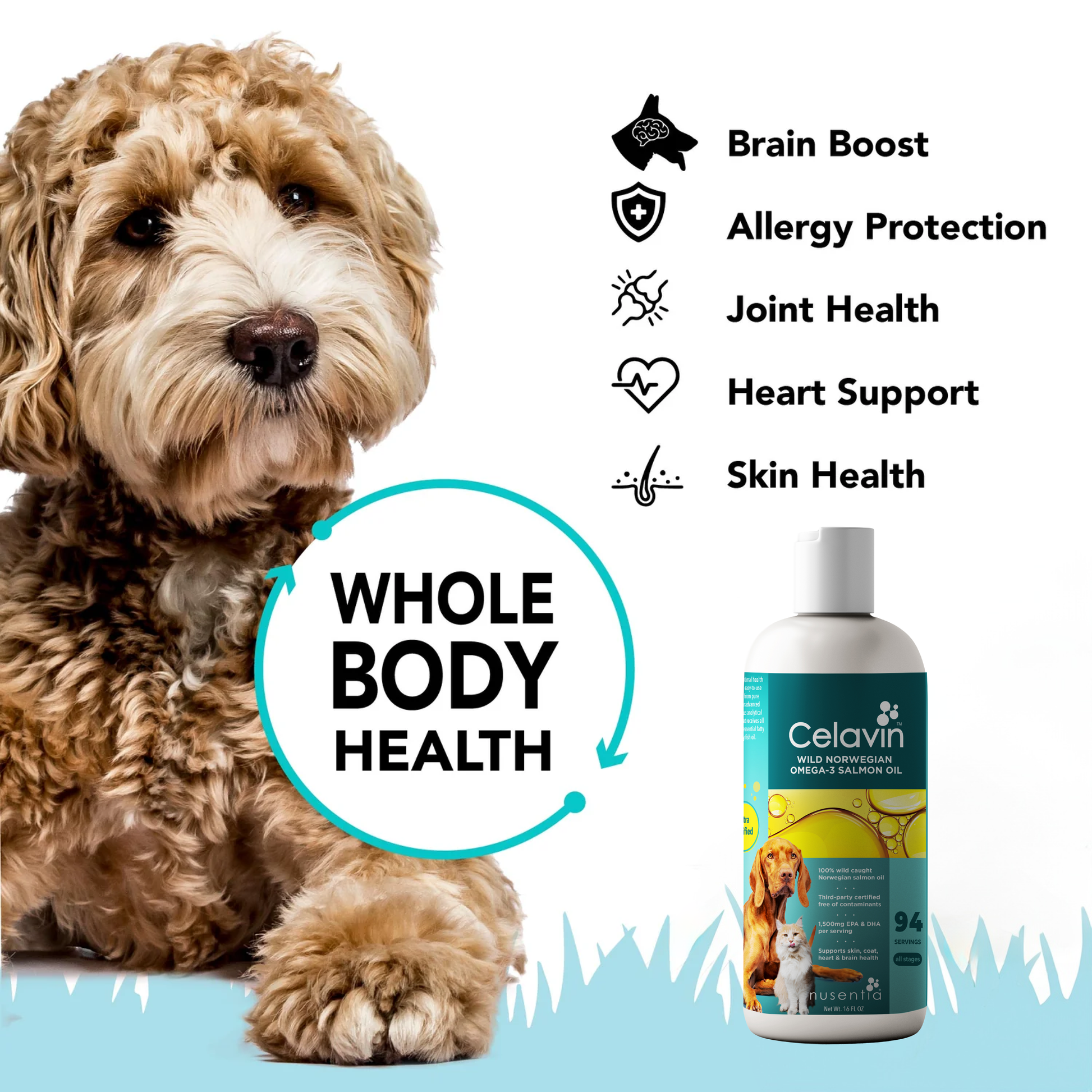With Celavin, when supplied daily, the omega-3 fatty acids (DHA, EPA) from fish oil saturate your pet’s body cells. These essential acids help "insulate" various areas and are known to significantly enhance inflammation management, joint health, skin and coat quality, immune system strength, cardiovascular health, and neural function. Wait 6-8 weeks to notice the full benefits of omega-3 supplementation in your pet.