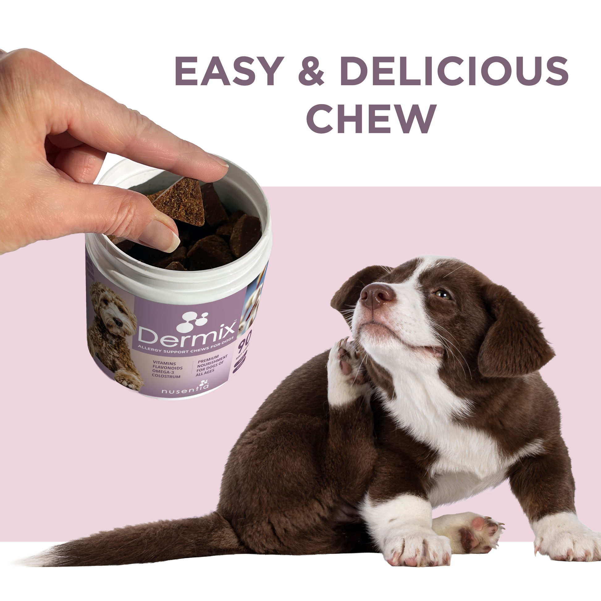 Dermix™ Allergy Chews are designed to be as tasty as they are beneficial, making them a treat your dog will look forward to. The chews are formulated to appeal to the canine palate, ensuring ease of administration while supporting your dog's health. Most dogs enjoy the flavor, and owners often report their pets eagerly anticipate their daily chew.