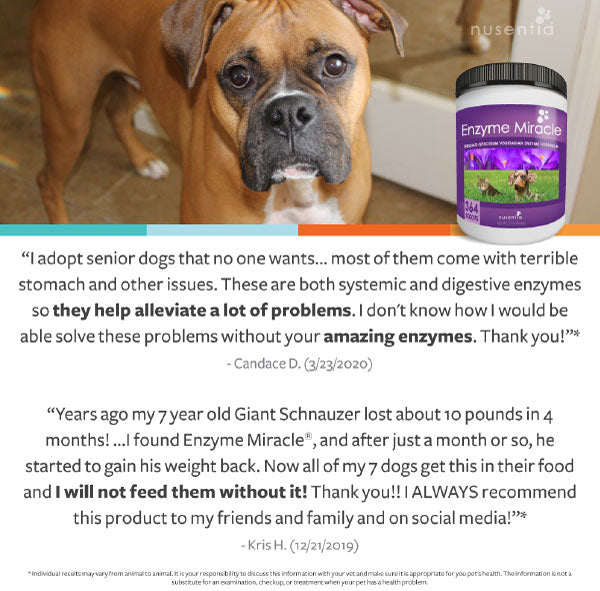 We've been using Enzyme Miracle for our blue heeler, Mist, for well over a decade. No vet was able to diagnose her back then but she had extreme sudden weight loss and cow patty stools. Nothing helped her except Enyme Miracle so it was truly a miracle! It definitely saved her life but sadly the new version is what has hastened her death. Even though it looked different -finer powder, slight pink color- I remained hopeful that it would solidify her stools and help her keep on weight as it had been doing for so many years, but after two of the big containers, I can tell you that it doesn't work anymore even after we increased the amount of Enzyme Miracle with every meal. We are heartbroken that our Mist is now dying at this very moment and the only thing that can be done is to keep her comfortable. She's 12yrs old and I'm sure we could've gotten at least another couple years out of her even with her condition and hard life: run in with coyotes, gopher poison, hit by a car.... We kept her alive through so many things and she bounced back time and time again! When I suspected the new version of Enzyme Miracle wasn't working, I tried many other products but none of them worked either. The original Enzyme Miracle was the best! If you happen to have any, cherish it! It's the one that's not as fine a powder and more off white or beige in color. And so Mist just declined rather rapidly and now we're almost at the end. We decided not to put her down because she's not in distress. The vet could only continue IV fluids but because her kidneys aren't working well now, she's just swelling so we decided to make her comfortable at home. So our hearts are broken and I also have the sting of being about $200 in the hole between my purchases of 2 large Enzyme Miracle containers which didn't work and the stuff from the The Pet Health & Nutrition Center which didn't do what our dog needed. Sorry I can no longer recommend this product.